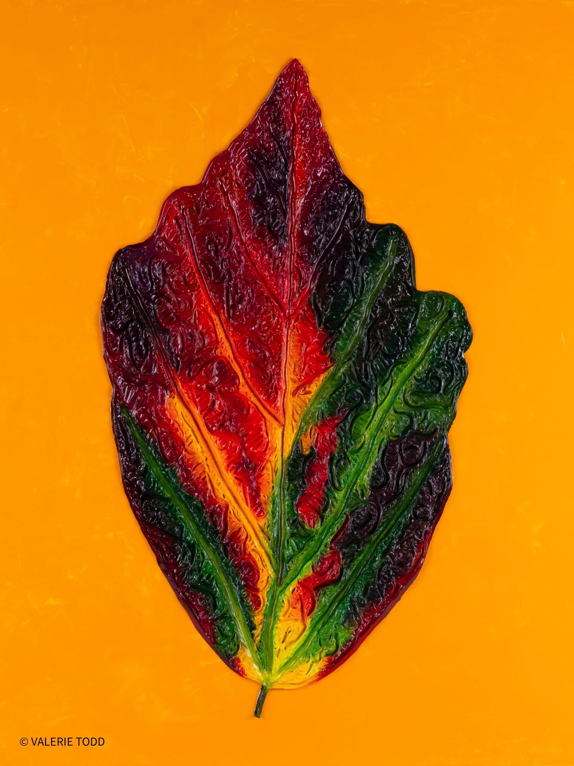 Intricately textured and sculpted with molding paste, Rainbow Leaf bursts with fire reds, deep purples, indigo blues, phthalo greens, and bright yellow accents. Set against a warm background of golden yellows and oranges, this vivid composition commands attention, bringing energy and vibrance to any space — a true statement piece celebrating color and form.